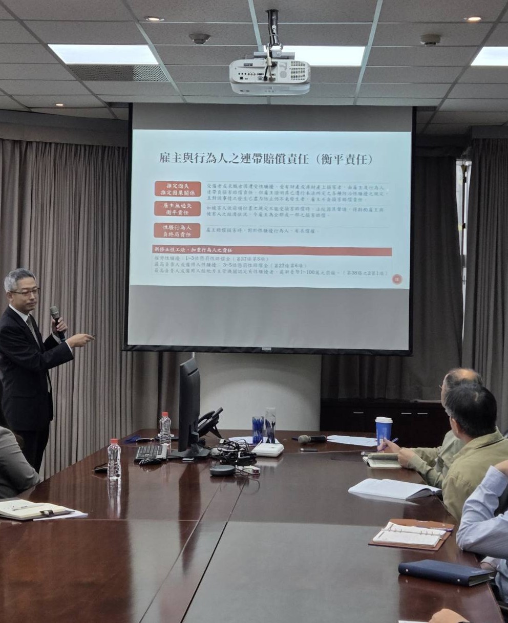 本所韓世祺主持律師於114年11月25日受邀擔任上市公司也是常年法律顧問客戶的性別平等工作法講座,與董事長、總經理及五十餘位高階主管分享性騷擾防治的概念及案例,其中包括韓世祺律師親自主辦、選入勞動部職場性騷擾申訴處理指導手冊中的指標案例(臺灣高等法院 109 年度重勞上字第 27 號民事判決)。韓律師結合理論與實務經驗,配合去識別化後的實際案例深入淺出,獲得與會人士一致肯定。